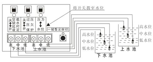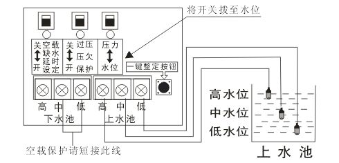 設(shè)置空載保護(hù)后,下水池不能接探頭。上水池的水用到中水位時會開始抽水,抽到高水位會水滿停機(jī),低水位訊號線起回路作用。