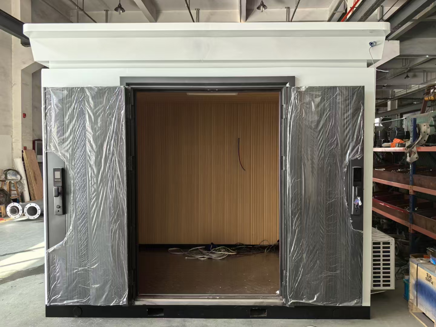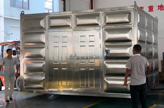 外墻為304不銹鋼材質(zhì),內(nèi)墻為環(huán)保生態(tài)墻板;墻板材料具有清潔方便、綠色環(huán)保、安裝快捷、時尚美觀、防火防潮等特點。地板為熱鍍鋅壓花鋼板,美觀堅固。