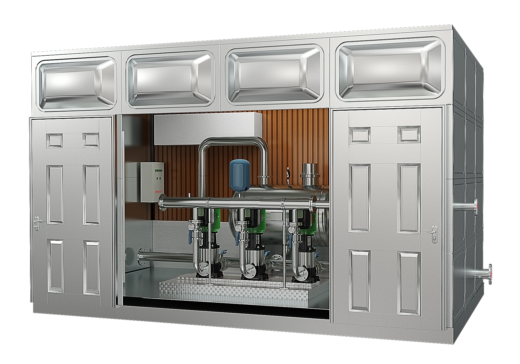 一體化智慧泵站外觀經(jīng)專業(yè)工業(yè)美工結(jié)合泵站的使用環(huán)境以及功能采用三維仿真成型而研發(fā)設(shè)計,外觀精美大氣,能完美融于環(huán)境,是傳統(tǒng)泵房而無法比擬的。