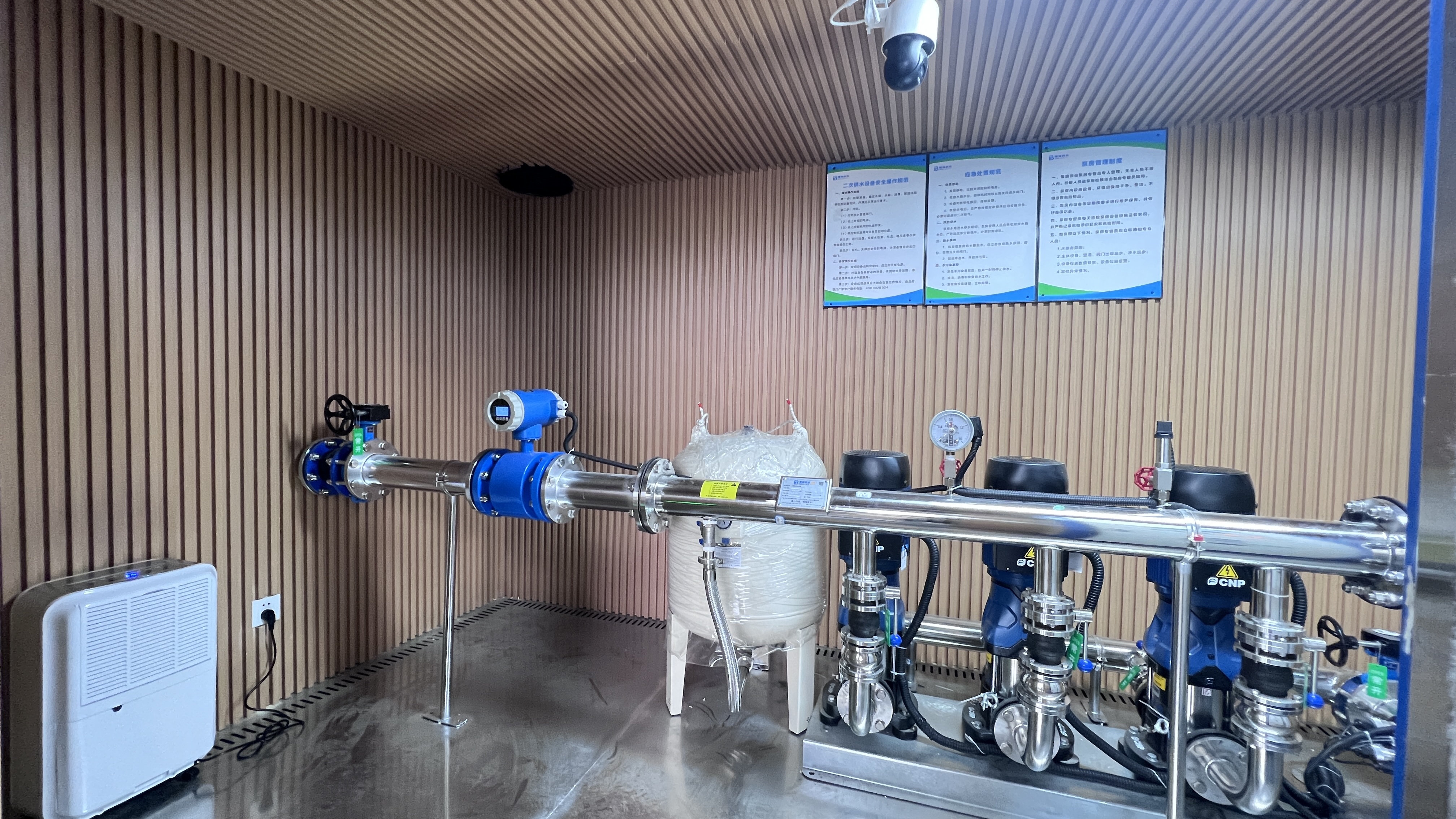 泵站將供水機組、電氣控制系統(tǒng)、安防系統(tǒng)、水質(zhì)監(jiān)測系統(tǒng)、遠程監(jiān)控系統(tǒng)、流量監(jiān)測設(shè)備、消毒設(shè)備、空調(diào)和除濕設(shè)備等集于泵站之內(nèi),泵站功能一應(yīng)俱全。